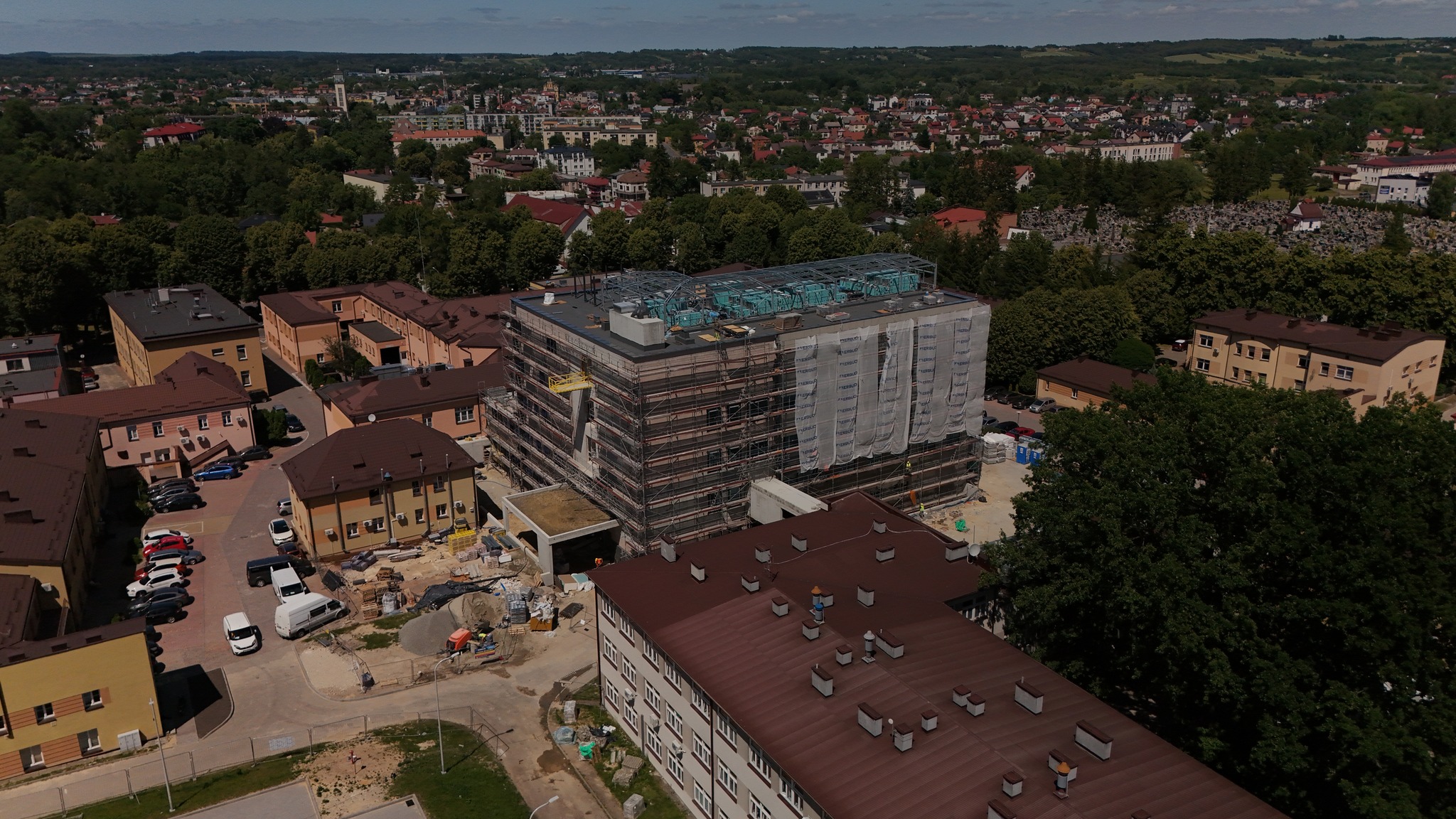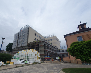 Wnętrza również zyskują swoją funkcjonalność! Wzniesiono już większość ścianek działowych, które wyznaczają przyszłe gabinety, sale i pomieszczenia techniczne. Na sufitach rozprowadzono liczne instalacje: wentylacyjne, elektryczne i wodno-kanalizacyjne – to kluczowe systemy, które zapewnią odpowiednie warunki i komfort użytkowania. W wielu pomieszczeniach trwają już zaawansowane prace wykończeniowe i montaż niezbędnych urządzeń technicznych. Na dachu budynku zamontowano już nowoczesne centrale wentylacyjne – to one będą dbać o stały dopływ świeżego powietrza do wszystkich pomieszczeń!