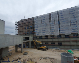 Konstrukcja budynku jest już całkowicie gotowa! Ukończono jej ostatnie kluczowe elementy – łącznik, który zapewni wygodne przejście do istniejącego Oddziału Neurologii i Leczenia Padaczek, oraz estetyczne zadaszenie nad wejściem głównym. Wszystkie okna są już zamontowane, zapewniając odpowiednie doświetlenie wnętrz i izolację. Trwają intensywne pracuje nad elewacją, która nie tylko będzie wizytówką obiektu, ale także zapewni mu trwałość i ochronę. Część fasady od strony północnej już prezentuje swoje jasne, nowoczesne wykończenie.