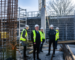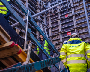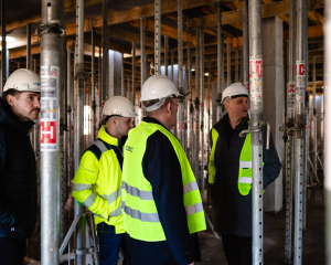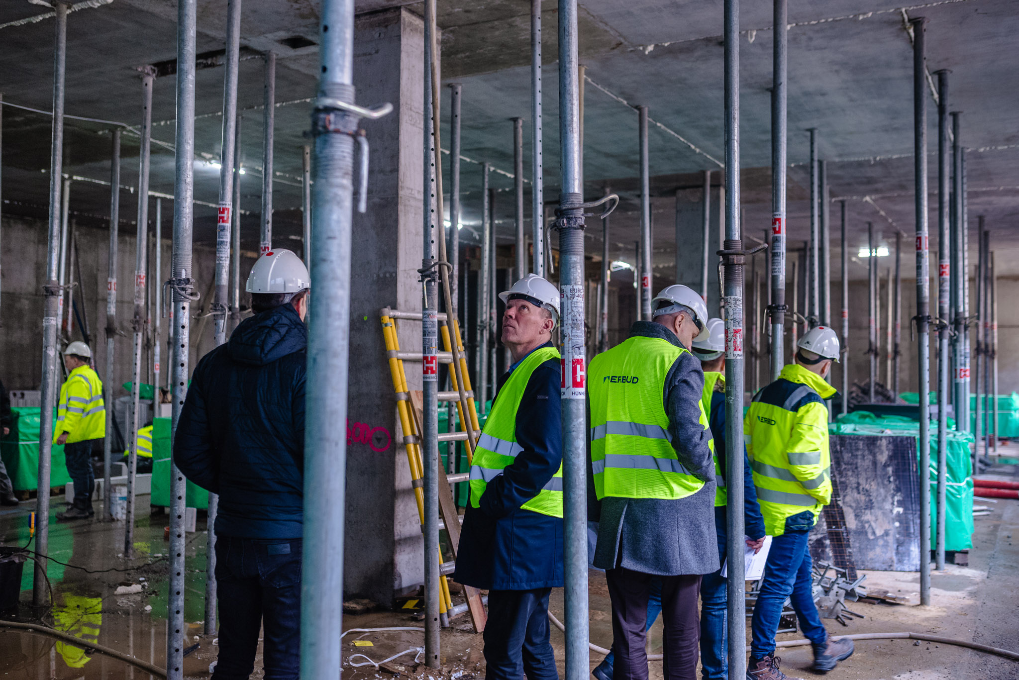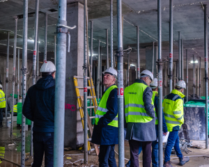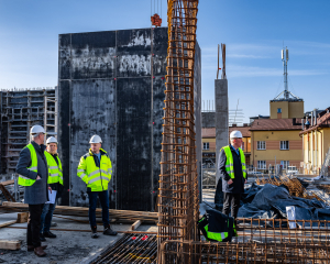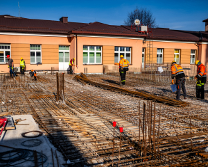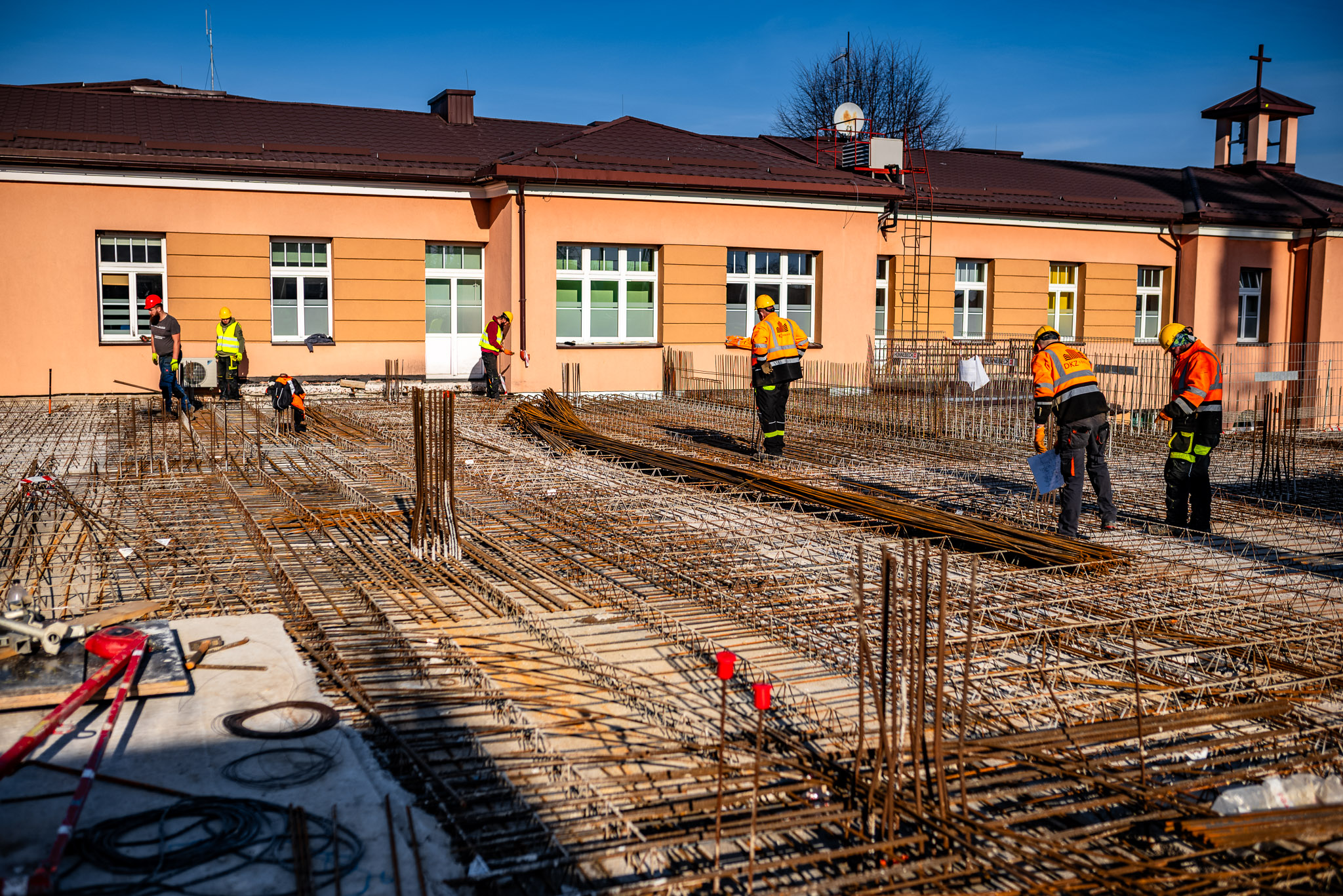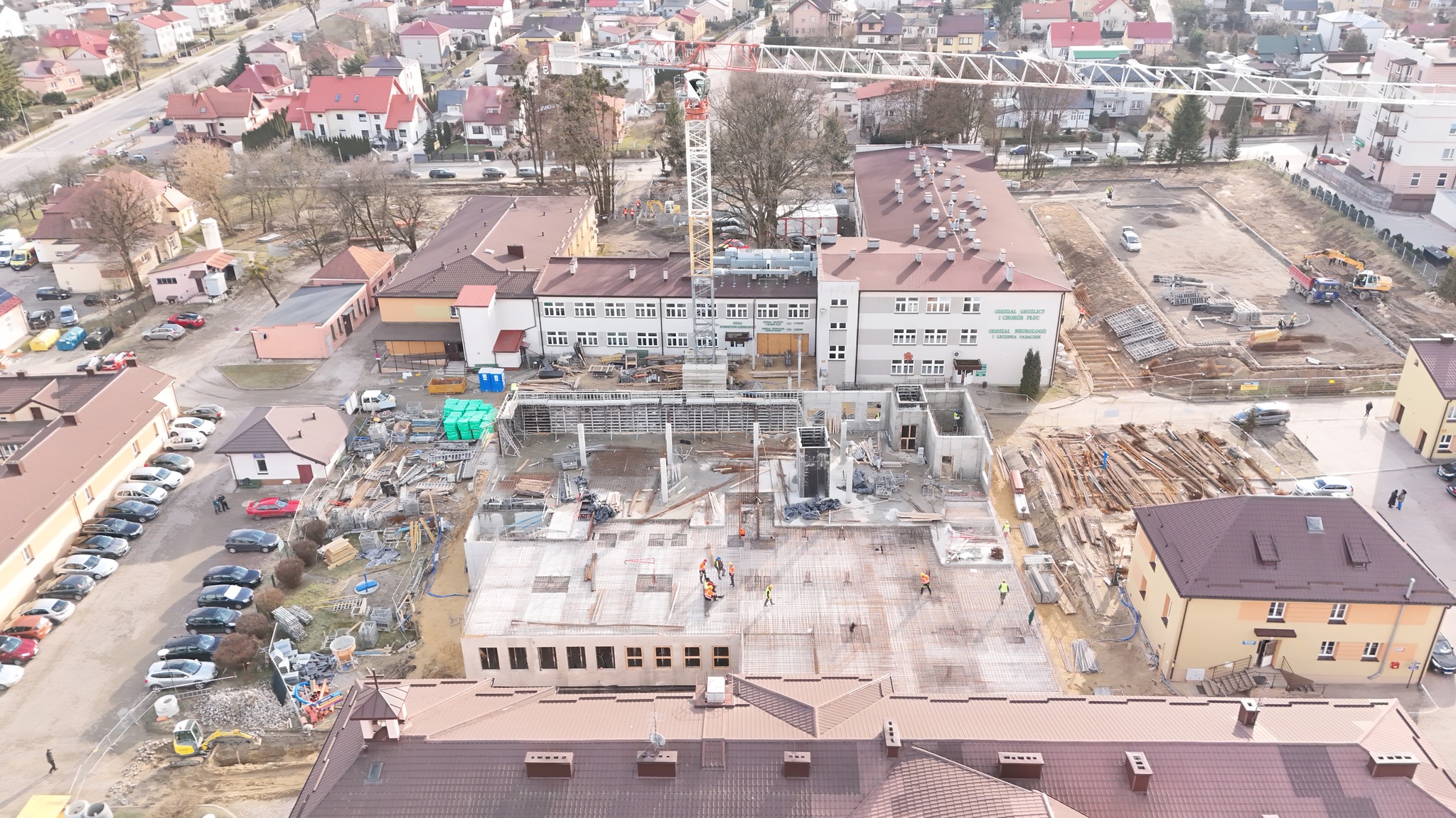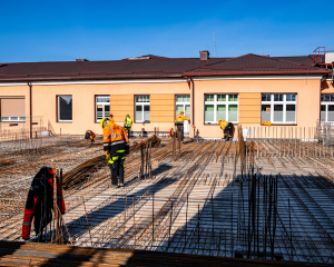 Kontynuowane są również roboty konstrukcyjne w budynku głównym, gdzie powstają kolejne żelbetowe ściany i słupy na piętrze+1. Rozpoczęto też prace murarskie w zakresie ścian działowych w kondygnacji piwnicy. Zakończono wykonywanie zasypek wokół budynku i rozpoczęto montaż rusztowania, co oznacza przygotowania do montażu stolarki okiennej i robót elewacyjnych.