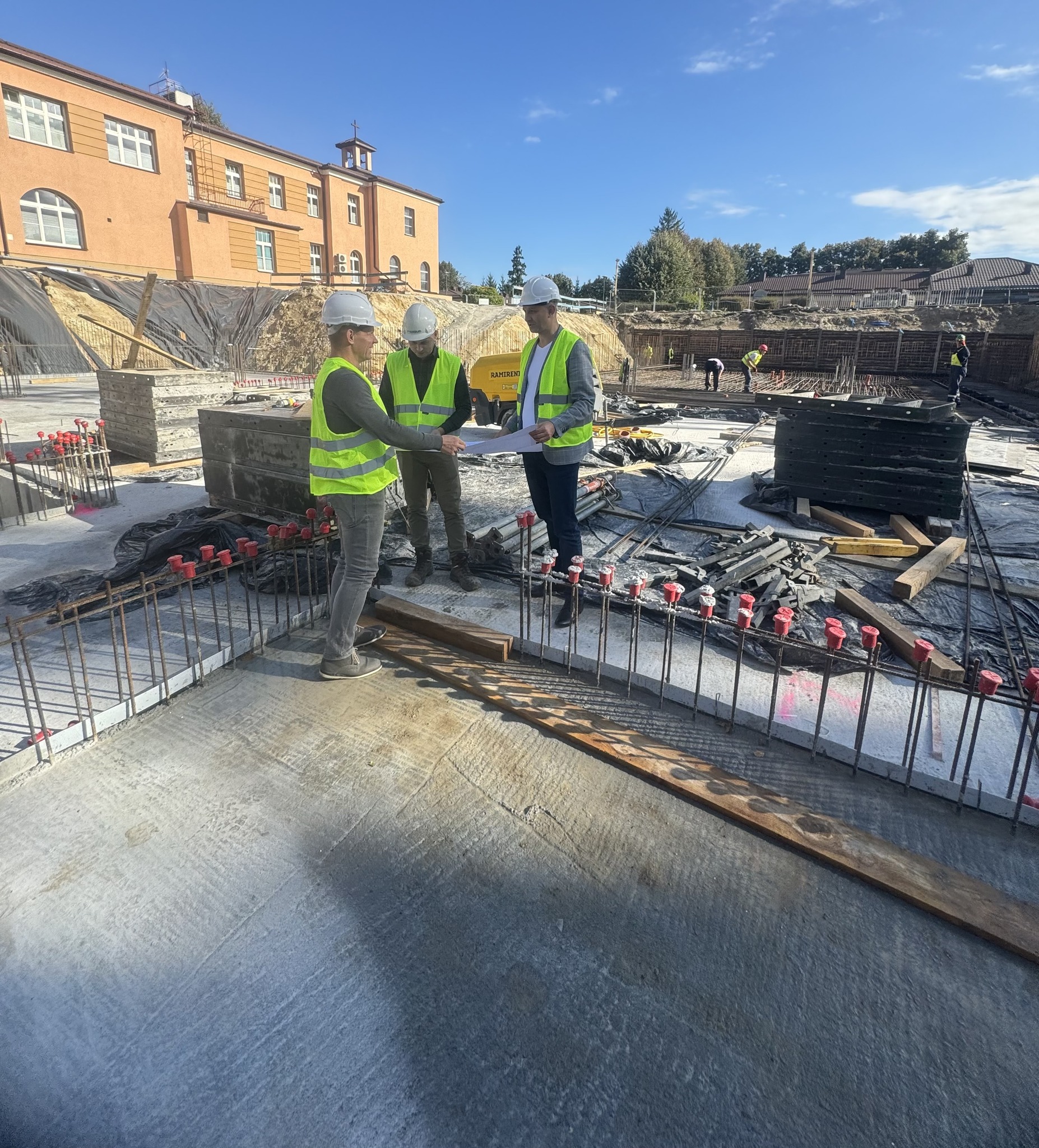 Prace ziemne w obszarze podpiwniczenia budynku również zostały zakończone. Położono beton podkładowy pod całą płytą fundamentową, na którym następnie rozpoczęto montaż zbrojenia oraz wykonano instalację kanalizacyjną i instalację odgromową znajdującą się w płycie fundamentowej. Równocześnie realizowana jest hydroizolacja części podziemnej.