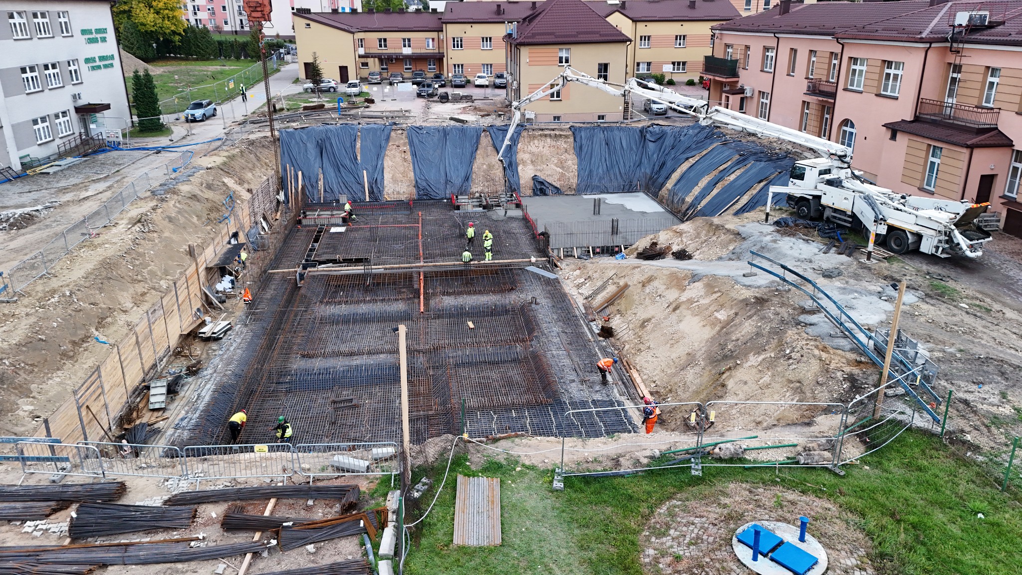 Wykonano już betonowanie około 60% płyty fundamentowej, a obecnie trwają prace nad zakończeniem zbrojenia pozostałej części. Dodatkowo zrealizowano już instalację kanalizacji deszczowej, która będzie odprowadzać wodę z parkingu.